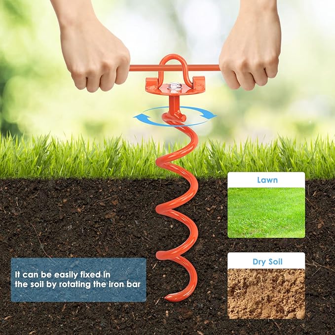• HAPPINESS OF LIFE - The orange spiral anchor stakes can bring a lot of relief and convenience to your life. When you want to read a book or listen to music in the garden, do not want your dog to destroy your flowers, you can use our heavy duty dog tie out stake to make the dog not easy to run around, and you can also fix your garden fence , Which is very useful. Our spiral ground anchor can fix your tent and trampoline without being affected by the weather.