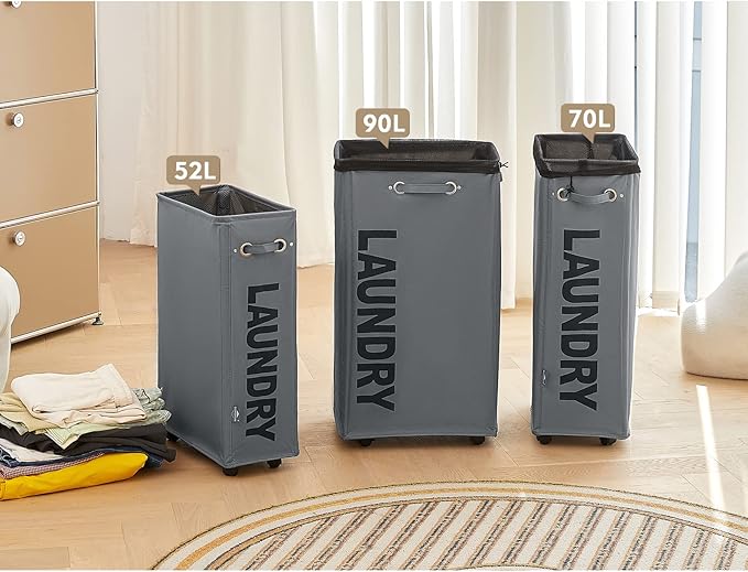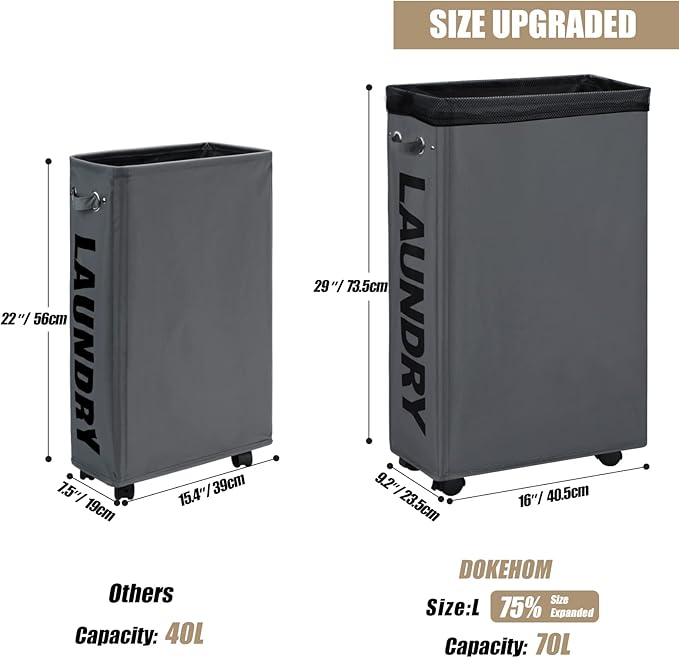 DOKEHOM 29-Inches Enlarged Slim Laundry Basket with Removable Wash Bag on Wheels, Collapsible Rolling Laundry Hamper, Foldable Narrow Corner Clothes Storage Bins (Dark Grey)