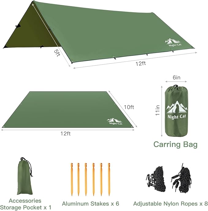 • 【Versatile Tarp】Night Cat Camping Tarp is great matching with Night Cat Camping Hammock Tent.Depending on different outdoor activities,this versatile tarps can be used as hammock rain fly, tent tarp,tent footprint, shelter, awning and so on.With built-in tie loops, the tarp shape of the settings can be adjusted for a variety of uses in different situations to meet your demands.