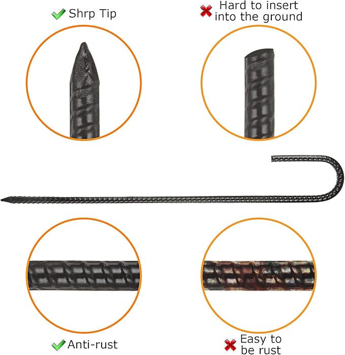 • Heavy Duty Material: Rebar stakes j hook is made of high quality steel, strong and durable, anti-rust coating makes Rebar stakes shiny and will not rust after long-term use.