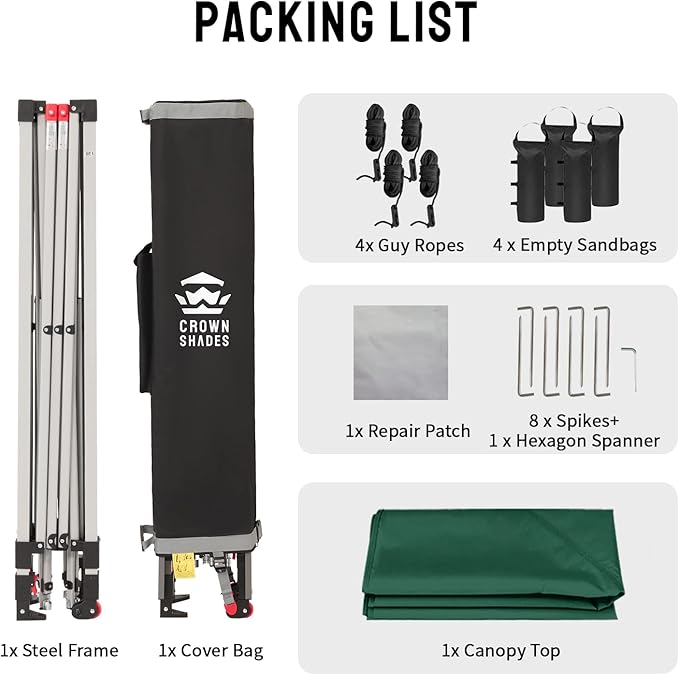 • STO’ N GO SYSTEM - Our lift-free system makes collapsing, storing, and transporting the 10x10 tent a breeze. The 10x10 popup canopy can be stored with the fabric attached, with a specialized pocket for 4 sandbags, 8 stakes, and 4 guy ropes. Integrated wheels in the feet allow easy movement even when the instant shelter tent is set up, by simply lifting the side without wheels. This feature is especially useful for quick setup and takedown at locations like the patio or sports events