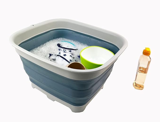 SAMMART 15L (3.9 Gallon) Collapsible Dishpan with Draining Plug - Foldable Washing Basin - Portable Dish Washing Tub - Camping & Space Saving Kitchen Storage Tray (Grey/Steel Blue)
