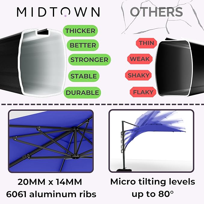 Midtown Umbrellas 10 Ft Outdoor Cantilever Patio Umbrella w/Terylast Royal Blue Fabric - Rotate Tilt 360° Offset Patio Umbrella, Deck Patio Umbrella, Backyard Umbrella & Garden Umbrella - Black Frame