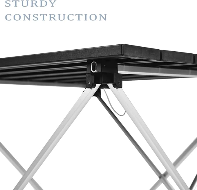 • Sturdy Construction ---- Our folding camping table is made of heavy-duty aluminum, the legs will not fold, bend or fall off with the stable foot cap, allowing it to be used on different terrains without the risk of tipping over. The triangular frame and sturdy joints make the foldable camping table can support 55 pounds of weight. So you can use this table for picnics or cooking with complete confidence