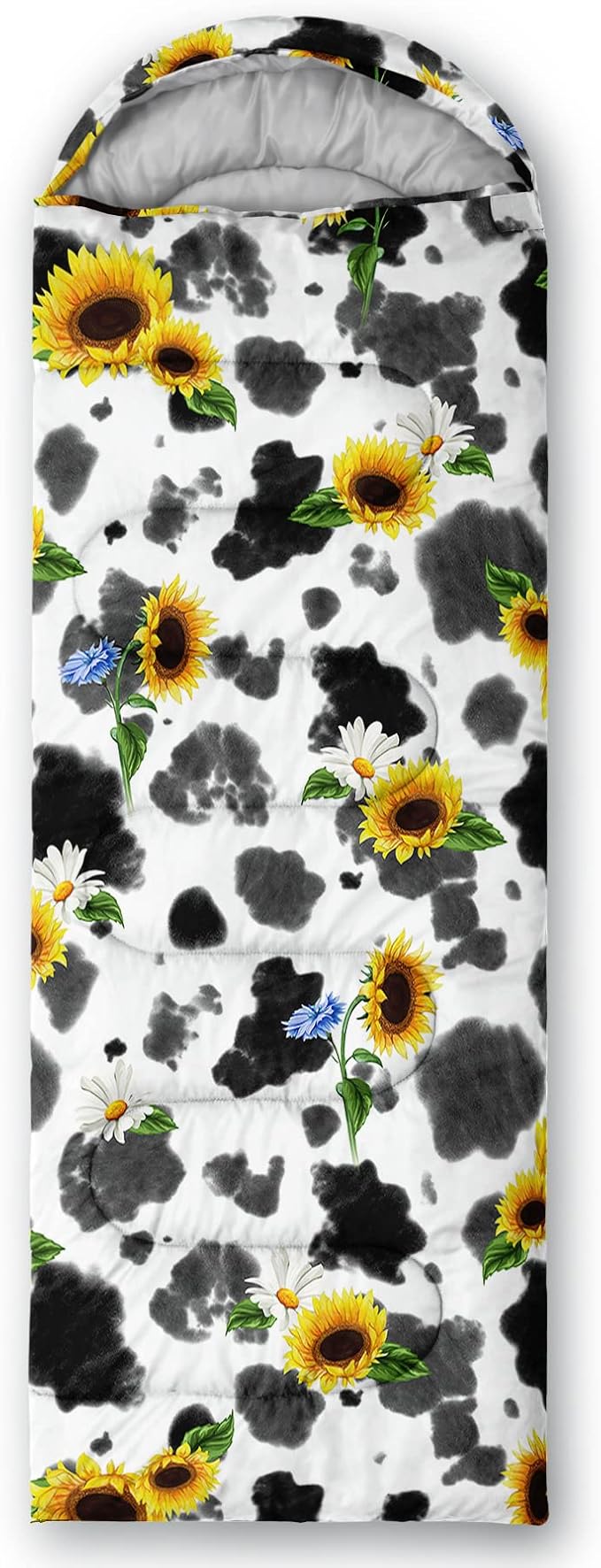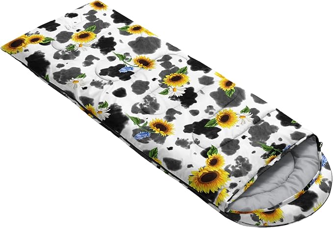 • A THOUGHT OUT DESIGN: Drawstring allows you to tighten hood and keep you warm. The idea of having a zipper at the foot to allow more warm or cool air to enter or exit the bag in different times of the season.Our Cow Pattern Sunflower sleeping bags are designed to provide much needed rest after a full day of outdoor activities.