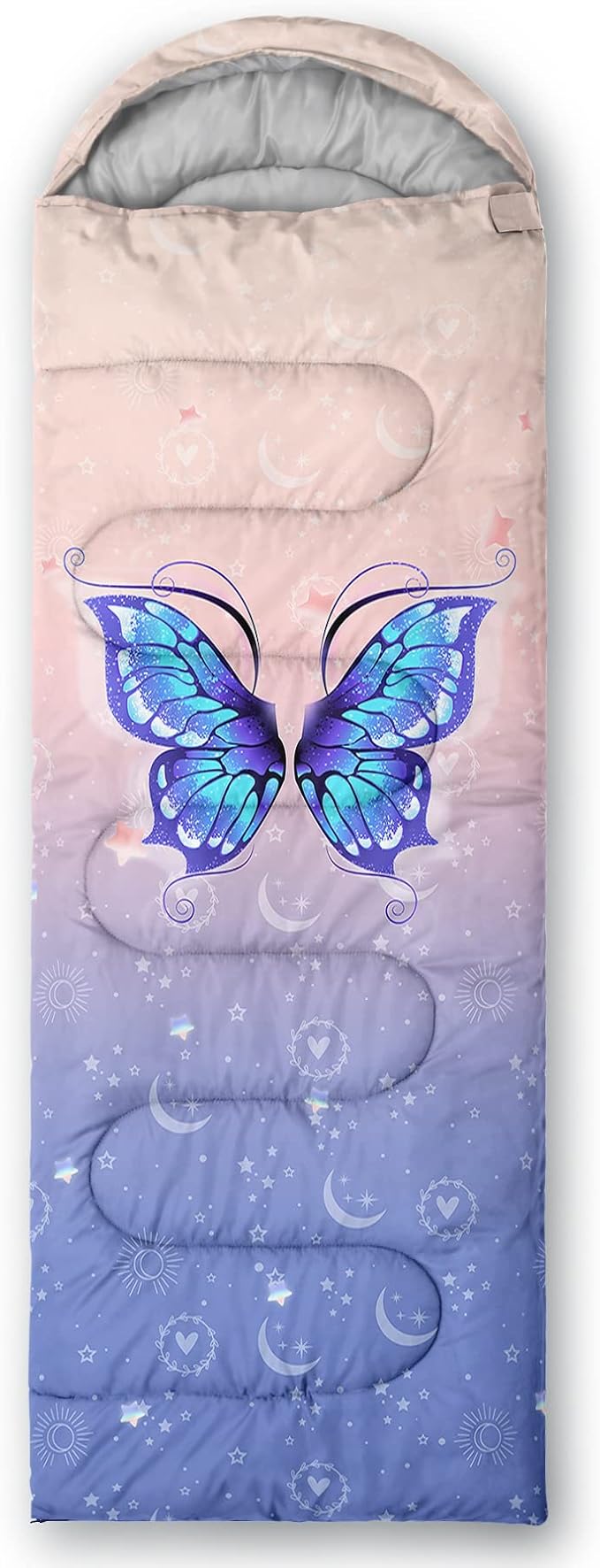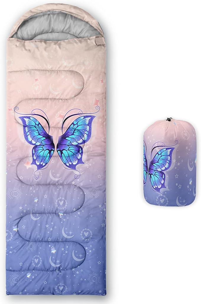 • A THOUGHT OUT DESIGN: Drawstring allows you to tighten hood and keep you warm. The idea of having a zipper at the foot to allow more warm or cool air to enter or exit the bag in different times of the season.Our Blue Butterfly sleeping bags are designed to provide much needed rest after a full day of outdoor activities.