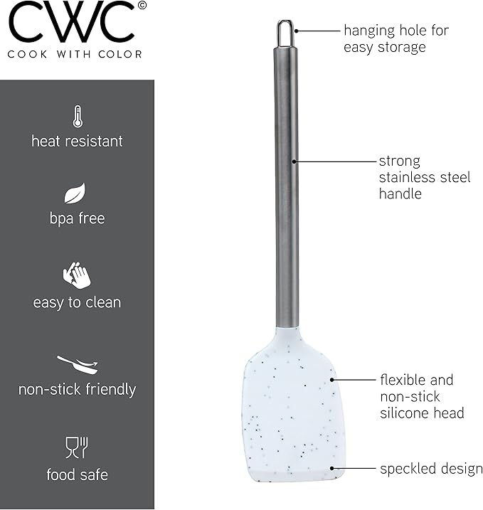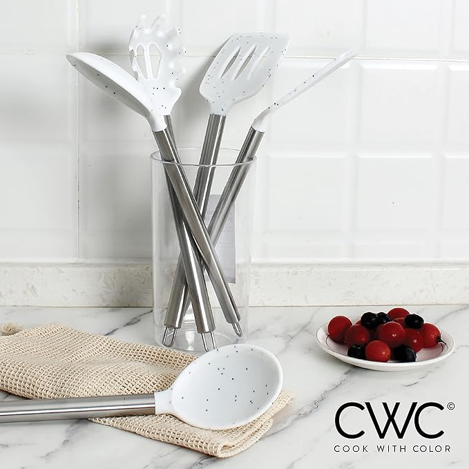 • White Speckled set, this set of silicone kitchen tools has an up to date, trendy look that is madly in line with the current styles and trends. Add a splash of color and funk to your kitchen and hang from the rings on each utensil.