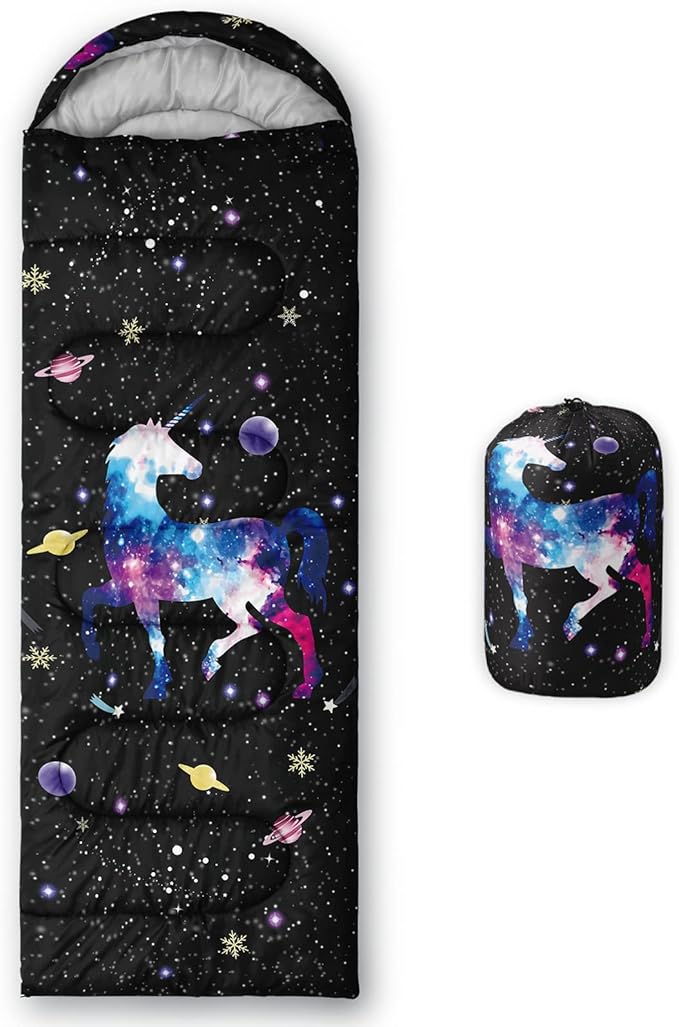 • A THOUGHT OUT DESIGN: Drawstring allows you to tighten hood and keep you warm. The idea of having a zipper at the foot to allow more warm or cool air to enter or exit the bag in different times of the season.Our Outer Space Unicorn sleeping bags are designed to provide much needed rest after a full day of outdoor activities.