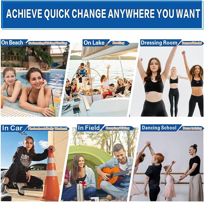 • [ Upgraded & Secret Design ] - The portable changing room is made of high quality fabrics, soft and durable material ensures optimal comfort for you. Light proof and thickened design allows you to change discreetly in public. Even cover it on wet skin, it will not stick on your body to reveal secret identity to surrounding people. Every package comes with a compact storage bag for easy carrying.