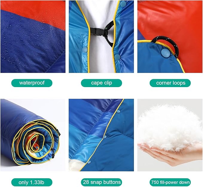 • In-style Versatile Design -- This warm camp quilt with unique snap buttons, cape clips, and corner loops quilted, you can easily turn the waterproof outdoor blanket into a cloak, a sleeping bag, a wearable blanket, or an attached hanging mattress, or join another to make it bigger for snuggling with your loved one.