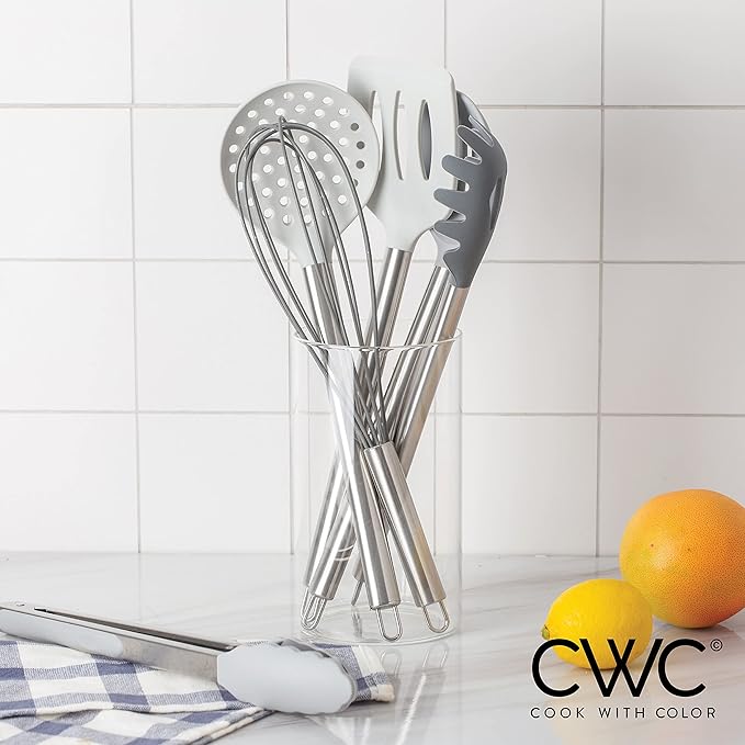 • Grey utensil set with metallic tones, this set of silicone kitchen tools has an up to date, trendy look that is madly in line with the current styles and trends. Add a splash of color and funk to your kitchen and hang from the rings on each utensil.