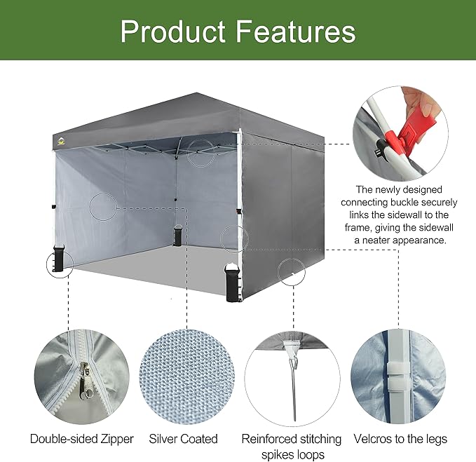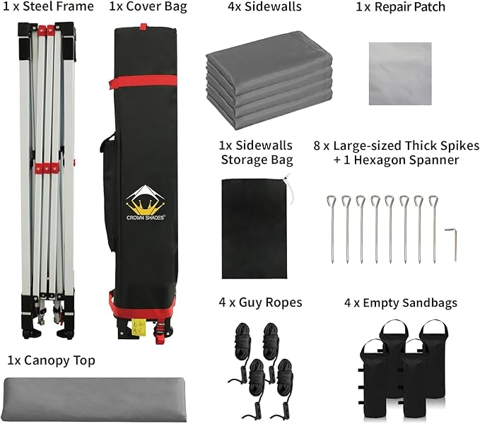• [STO'N Go Bag]: Transporting and storing camping gear has never been easier than with the newly designed patented STO'N Go Bag. It comes equipped with a specialized pocket designed to hold 8 stakes, 4 guy ropes, and 4 removable wall panels. With its compact size, it can fit comfortably in most vehicles, so you can take your canopy with you wherever you go.