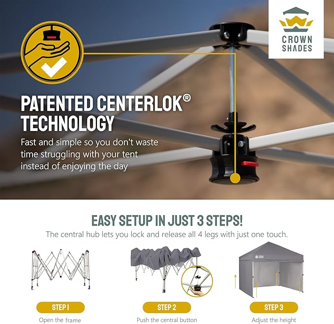 • [EASIEST SET UP]: The patented central lock technology allows you to lock all four legs with a single push at the center hub. The leg height can then be adjusted using soft, pinch-free buttons. The next-generation canopy has been designed for ease of use, allowing two people to set it up in a matter of seconds without the need for any tools.