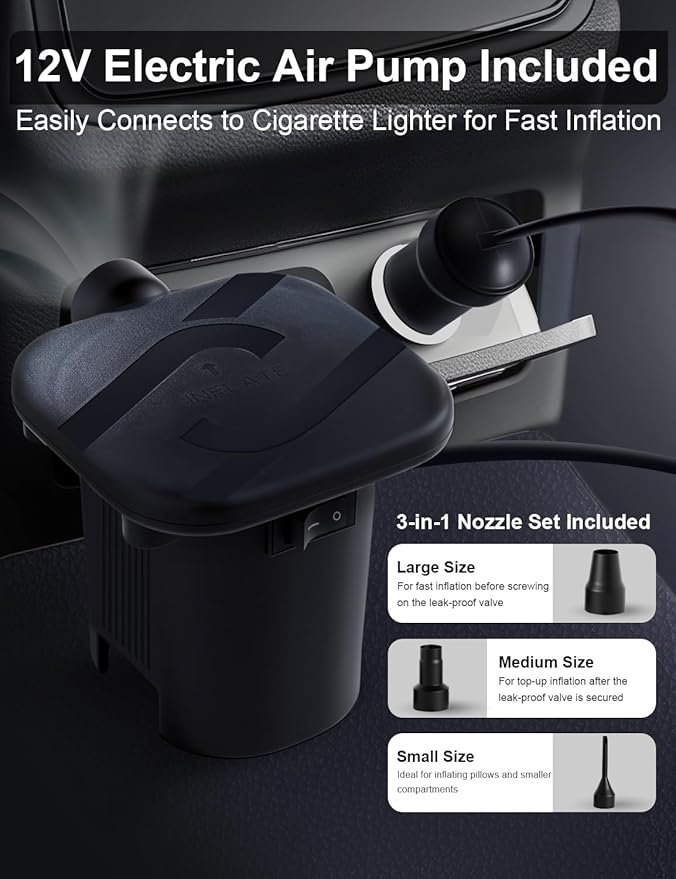 • Quick Inflation & High Weight Capacity: The included electric car pump inflates and deflates the mattress in minutes. With a weight capacity of up to 300 pounds, it comfortably accommodates up to two people, ensuring a restful sleep for everyone.