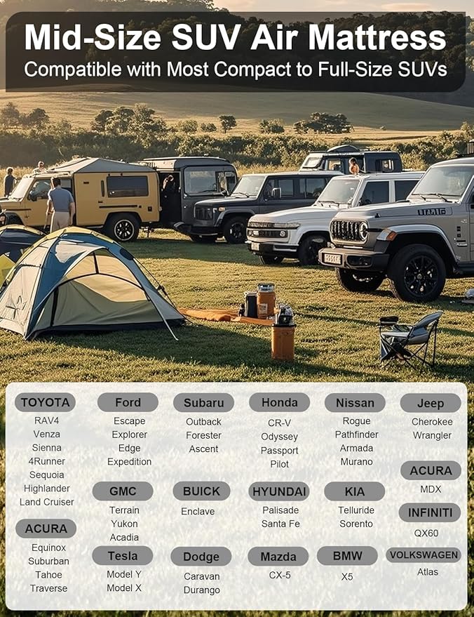 • Fitment Guide: This SUV air mattress measures 6.07 ft (185 cm) when fully flat, or 5.4 ft (165 cm) with the head support raised. It is designed to fit most compact to full-size SUVs with interior lengths between 5.4–6.07 ft (measured from the back of the front seats to the trunk door). Please measure your vehicle’s interior before purchasing. If you have any questions, our customer service team is always here to help.