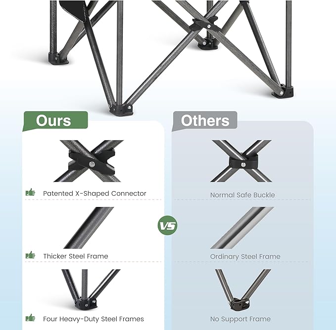 • Sturdy Material: This lawn camping chair for adults has hammer tone powder coating that can prevent corrosion and fading. Four heavy-duty steel frame was added to the bottom of the chair and enforce stability. Sturdy steel frame construction make it can support up to 450lbs/200kg.The 600D Oxford fabric is resistant to tears and abrasions, ensuring that this chair will last for years to come