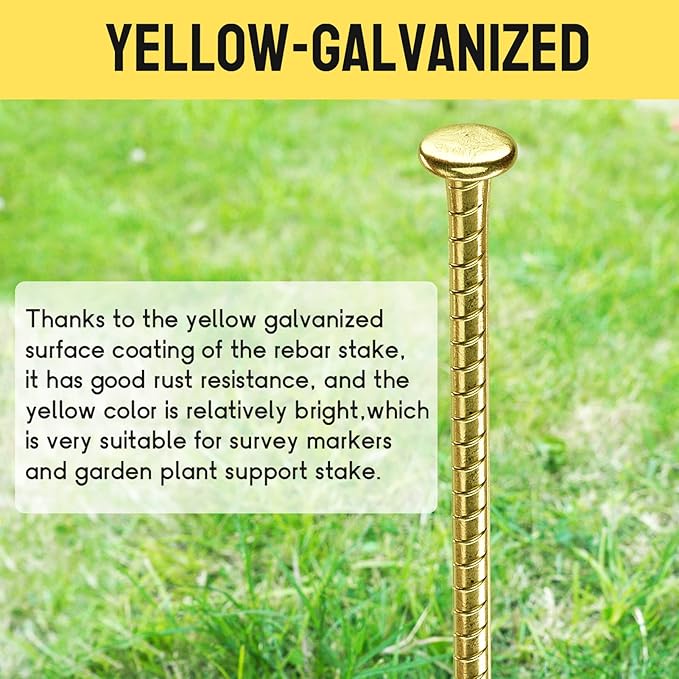 • YELLOW-GALVANIZED:Thanks to the yellow galvanized surface coating of the rebar stake, it has good rust resistance, and the yellow color is relatively bright, which is very suitable for survey markers and garden plant support stake.