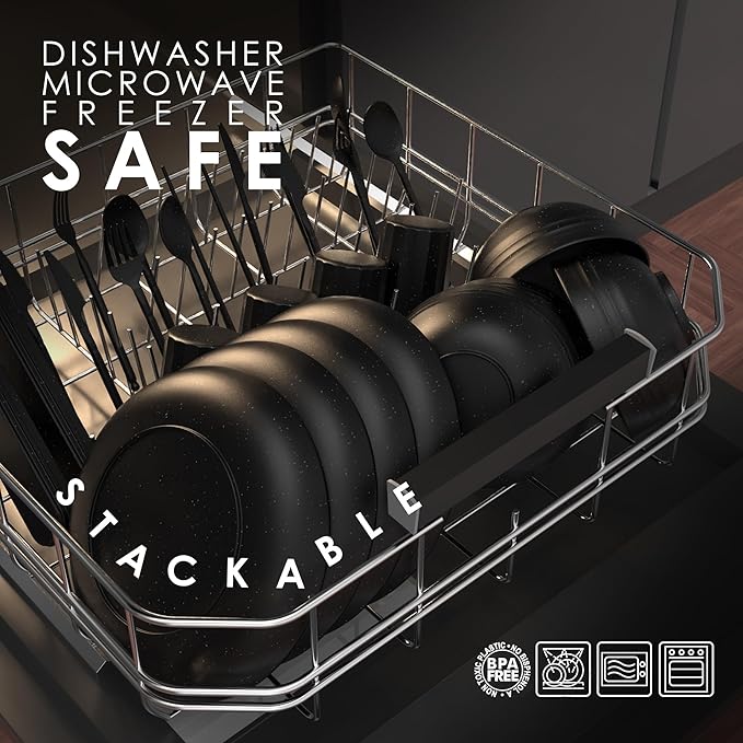• STACKABLE & NON STAINABLE : Our Lightweight Dinnerware Set Is A Healthy Alternative To Plastic Dishes Set. The Dorm Kitchen Essentials aka Rv Dinnerware Sets Are Stain Resistant & Travel Friendly!