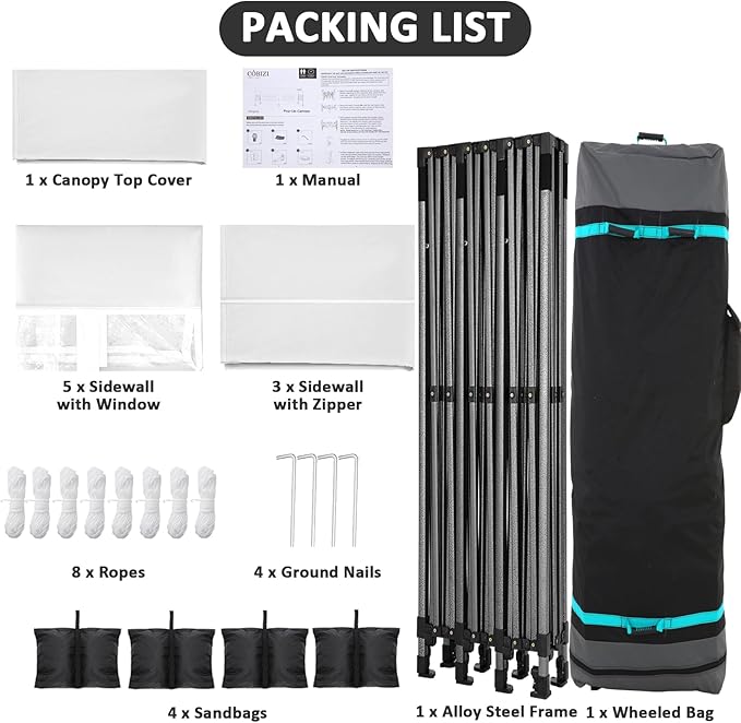 • 【Wheeled Storage Bag】10x30 canopy wheeled roller bag size is 164x66x24cm (64.6x26.0x9.4inch), 600D Oxford Cloth fabric. Storage bag with 4 wheels on the bottom for easy transport. 3 handle on the side for 2 people to lift. 1 handle on the top for 1 people to glide. The Package Includes: Pop up Canopy Frame x 1Pcs + 10′x30′ Canopy Tent Top Cover x 1Pcs + Sidewall with Zipper x 3Pcs + Sidewall with Window x 5Pcs + Sandbag x 4Pcs + Ground Nails x 4Pcs + Ropes x 8Pcs + Wheeled Storage Bag x 1Pcs.