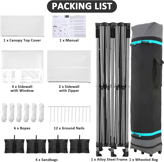 • 【Wheeled Storage Bag】10x20 canopy wheeled roller bag size is 169x46x24cm (66.5x18.1x9.4inch), 600D Oxford Cloth fabric. Storage bag with 3 wheels on the bottom for easy transport. 3 handle on the side for 2 people to lift. 1 handle on the top for 1 people to glide. The Package Includes: Pop up Canopy Frame x 1Pcs + 10′x20′ Canopy Tent Top Cover x 1Pcs + Sidewall with Zipper x 2Pcs + Sidewall with Window x 4Pcs + Sandbag x 4Pcs + Ground Nail x 12Pcs + Rope x 6Pcs + Wheeled Storage Bag x 1Pcs.