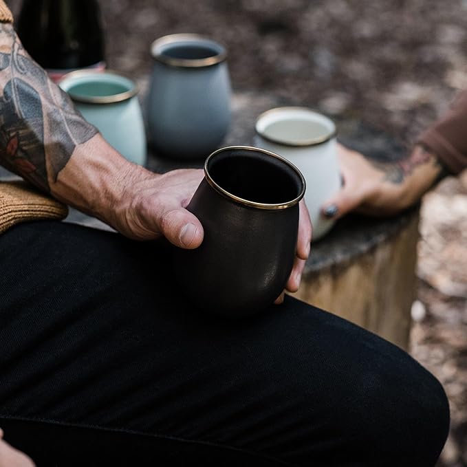 • UNIQUE AESTHETICS: Each tumbler showcases a hand-finished, baked stainless steel rim with a distinctive bronze-like patina, complemented by a speckled eggshell enamel finish for a vintage-inspired look