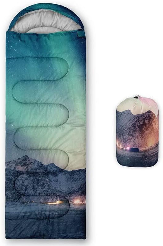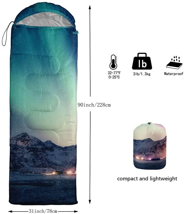 • SUITABLE:The sleeping bag can be used for 3 Seasons.SIZE:80*230cm Suggenal extreme temperature: 41 ℉ -77 ℉.Applicable in a variety of scenarios,such as Travel camping pajamas party,It's very suitable for you to travel with your children.Half-circle hood with adjustable drawstring,which can keep you warm and prevent your humidity