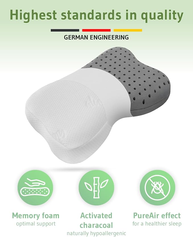 • ERGONOMIC - The pillow's memory foam with activated charcoal helps prevent neck and back pain thanks to its ergonomic design and the quality materials used. The cervical pillow relaxes the spine and provides a correct back and shoulder position for a regenerative night's sleep.