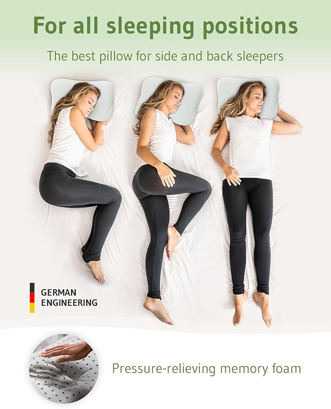 • OPTIMAL FOR IN EVERY SLEEPING POSITION - The innovative shape of the side sleeper pillow is perfect for all sleeping needs. Whether you sleep on your back, side or in a fetal position. Thanks to different shaping on the front, back and edges you can turn it to find the ideal position for your needs.