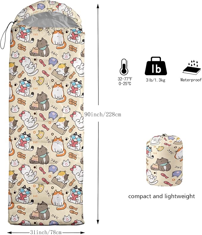 • FITS FOR 3 SEASONS: SIZE - 31 by 90 inches (W x D). Our sleeping bag can be used in 3 seasons with a design temperature of 32℉-77℉(0℃-25℃). These bags also have a weather resistant waterproof design to keep you warm and prevent you from any dampness.