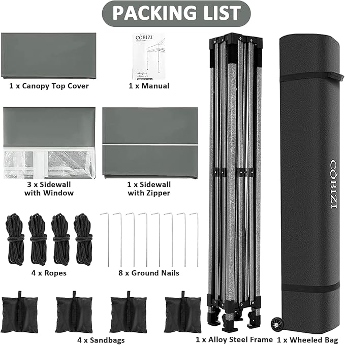 • 【Packing List & After-sale Protection】Pop up canopy 10x10 tent Top Cover x 1, Pop Up Canopy Frame x 1, Sidewall with Zipper x 1, Sidewall with Window x 3, Sandbag x 4, Ground Nails x 8, Ropes x 4, Wheeled Storage Bag x 1. We have a professional service team and provide 24/7 customer service to help you with any questions or queries you may have while using COBIZI products. One year after-sale protection for the canopy frame; Six months after-sale protection for fabrics and accessories.