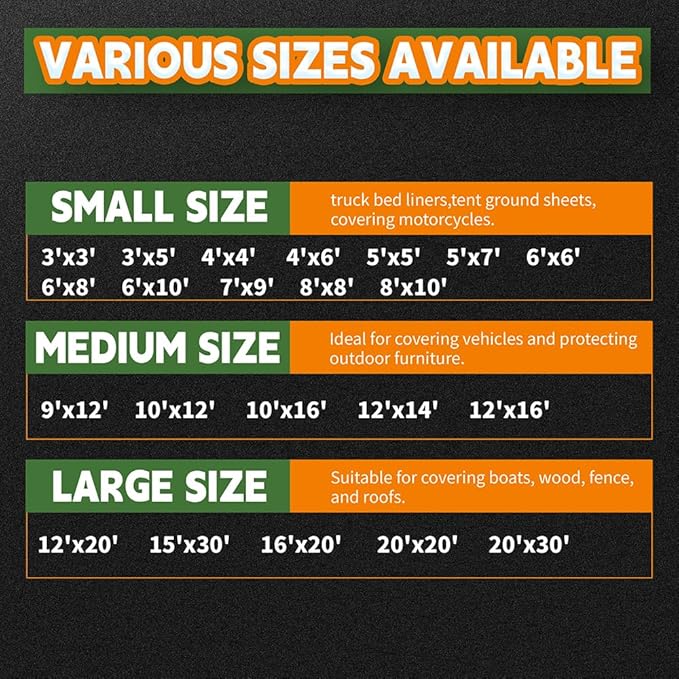 • 【UV RESISTANT TARP + WEATHER PROOF TARP】Provide an UV protection ,Just the right thickness needed to protect from the elements, Mother Nature can be unpredictable, but you can be prepared