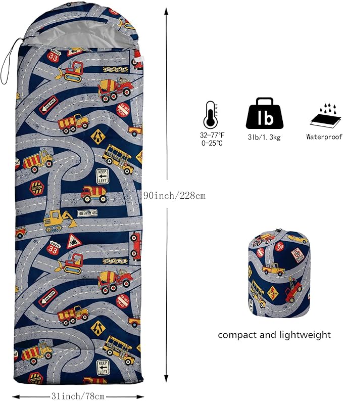 • SUITABLE:The sleeping bag can be used for 3 Seasons.SIZE:90.5"L x 31.5"W Suggenal extreme temperature: 41 ℉ -77 ℉.Applicable in a variety of scenarios,such as Travel camping pajamas party,It's very suitable for you to travel with your children.Half-circle hood with adjustable drawstring,which can keep you warm and prevent your humidity