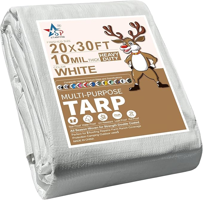STARPYNG-10 Mil White 20x30 Feet Tarp-Heavy Duty Poly Tarpaulin-Waterproof Tarp, UV Resistant, Durable, Weather Resistant, Cover Car, Swimming Pool, Boat