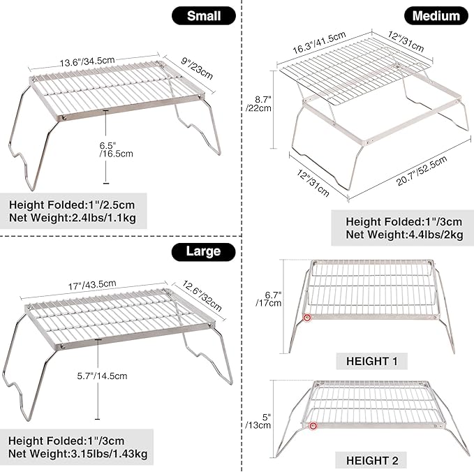 • 2 Heights Available:This foldable backpacker camping grill mesh has 2 holes on every side, this design provides us 2 heights available which are 6.3”/16cm and 4.7”/12cm. Choose different holes to adjust the height.