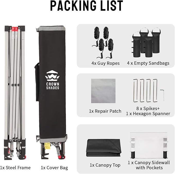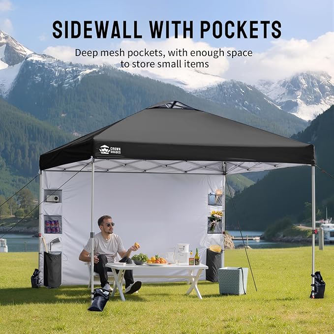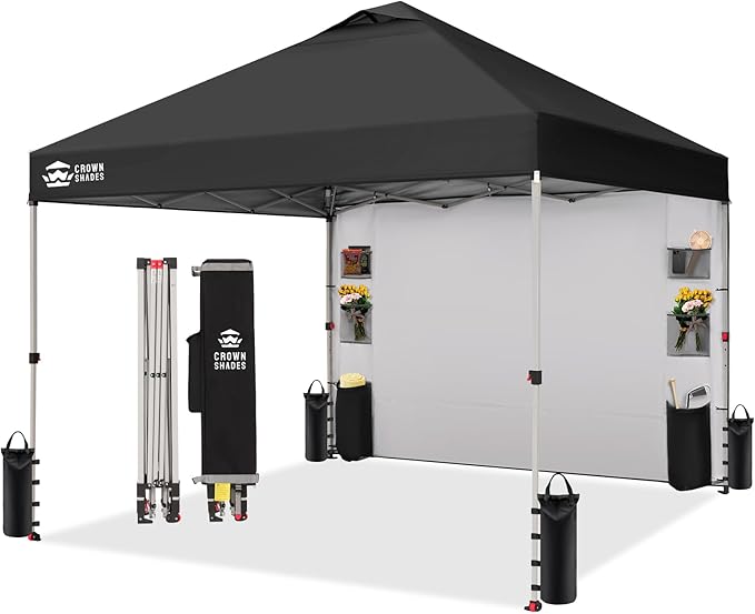 CROWN SHADES Canopy Tent, 10 x 10 Foot Portable Pop Up Outdoor Shelter with Pocket Sidewall, Push Center Lock, UV Protection, and Carry Bag, Black
