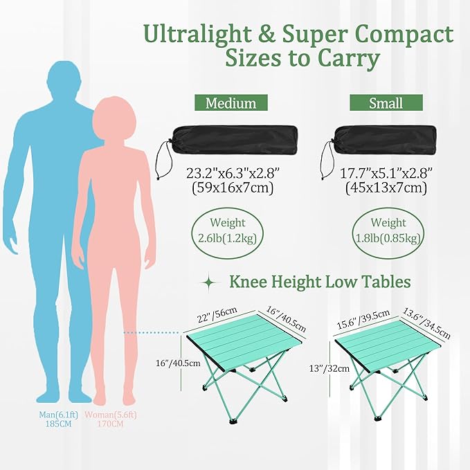 • Ultra lightweight and easy to carry - Our folding camping table has an aluminum tabletop and frame, so it is lighter than another wooden camping table of the same size, with a weight (Small: 1.85 pounds / Medium: 2.6 pounds / Large: 3.3 pounds) that is lightweight enough to carry. It can be folded into the accompanying handbag, placed in a backpack, or placed anywhere needed. The small camping table provides a stable working platform for amateur enthusiasts. This portable camping table is the perfect companion for portable camping chairs or folding stools. You can even use it as a folding beach table, or a tent table sitting on a beach mat or camping mat.