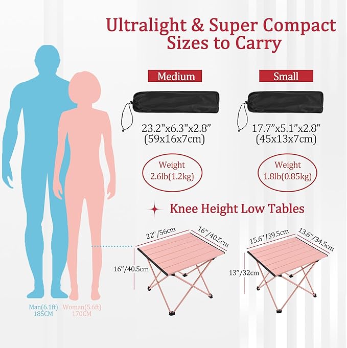 • Ultra lightweight and easy to carry - Our folding camping table has an aluminum tabletop and frame, so it is lighter than another wooden camping table of the same size, with a weight (Small: 1.85 pounds / Medium: 2.6 pounds / Large: 3.3 pounds) that is lightweight enough to carry. It can be folded into the accompanying handbag, placed in a backpack, or placed anywhere needed. The small camping table provides a stable working platform for amateur enthusiasts. This portable camping table is the perfect companion for portable camping chairs or folding stools. You can even use it as a folding beach table, or a tent table sitting on a beach mat or camping mat.