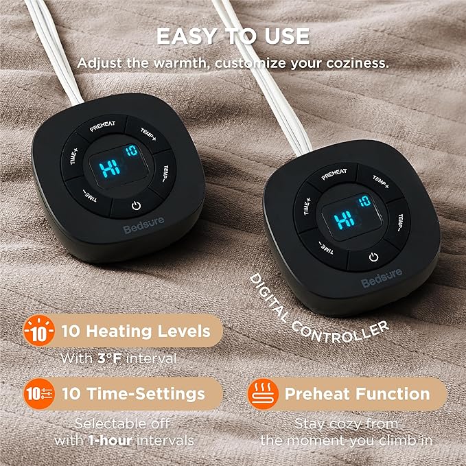 • Customizable Warmth: Featuring fast and consistent heating, this heated blanket queen size offers 10 heating levels and 10 time-settings for customizable coziness. Powered by advanced heating wire technology, it can precisely control temperature, ensuring safer warmth