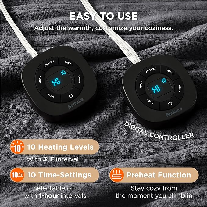 Bedsure Electric Blanket Queen Size - Dual Control Heated Blanket Queen, Fast Heating with 10 Time Settings & 10 Heat Settings, Warm Gift for Grandma (84x90 inches, Dark Grey)