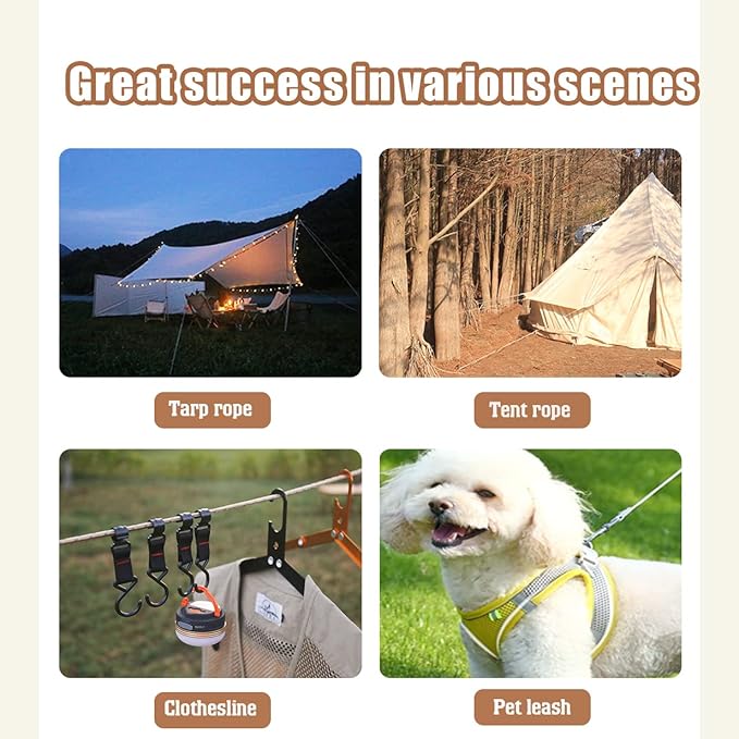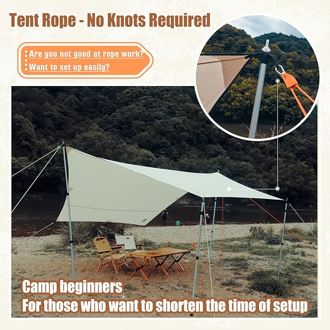 • 🌳Make Camping Easier and Faster:Only need hook the hammock,tent tarp or tent stakes by the carabiners,then use the pulley to adjust the rope length for you need,reduce the set up time and eliminates time-consuming hitch knots;