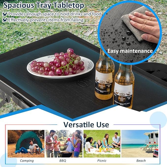 • Large Tabletop & Stable Structure: The spacious tray tabletop measures 29” x 16” (L x W), providing enough space to hold drinks and food while effectively preventing items from falling. You can also fold the supporting legs, using it as a tea table. Besides, the table is supported by a rustproof and high-strength aluminum alloy frame, ensuring good stability and a large loading capacity of 66 lbs.