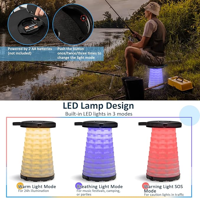 • LED Lamp Design: The stools are equipped with built-in LED lights in 3 modes, and you can easily change the light mode by pushing the button once/twice/three. The warm light mode is suitable for 24h illumination, the breathing light mode for music festivals, camping, or parties, and the warming light SOS mode for caution lights in traffic.