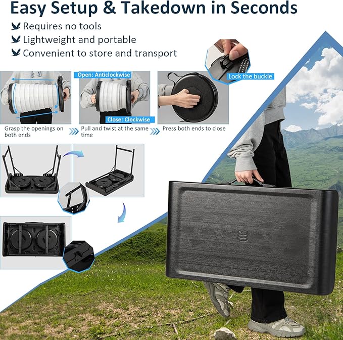 • Portable & Lightweight Design: The camping table and stools can be easily folded into a compact size, and 2 stools can be fixed in the folding table, which is convenient to store and transport. There exists a carrying handle on the table and an adjustable carrying strap on the stool, thus you can also lift the folding stool on the shoulder.