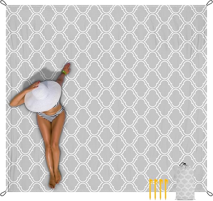 • Wind Resistant : Our gray geometric style beach blanket comes with 4 anchor stakes and 4 sand pockets. On windy days, if you don't have a lot of stuff on your beach mat, just fill the built-in corner pockets with sand to weigh it down or use the four included stakes to keep it in place.