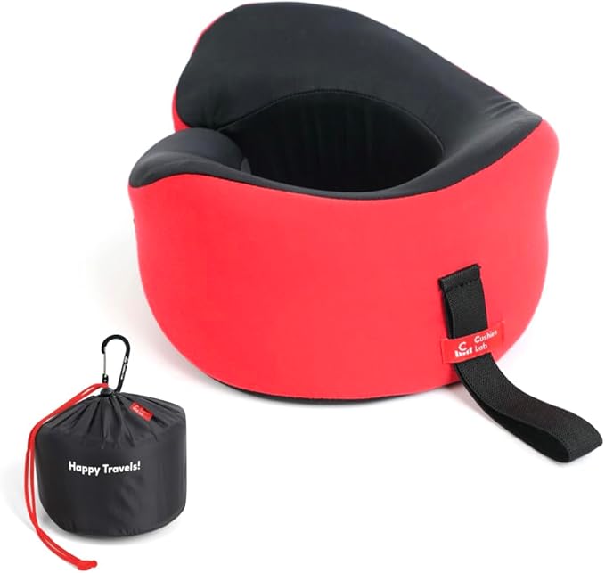 C CUSHION LAB Travel Pillow, Award-Winning Patented Ergonomic Design for Chin & Neck Support Memory Foam Neck Pillow, Compact Airplane Pillow for Traveling, Flight, Car (Bold Red, Large)