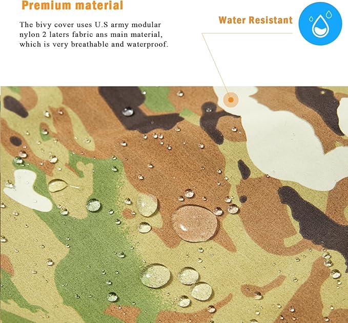 • MT Bivy Cover Fabric Using 3 laminating glue,Waterproof and breathable fabric,and wind-resistant fully seam pressed. The outer layer is made of nylon water-repellent, scratch-resistant and tear-resistant material. Size: 86.6x35.4x28inch. It is in Army OCP Color.