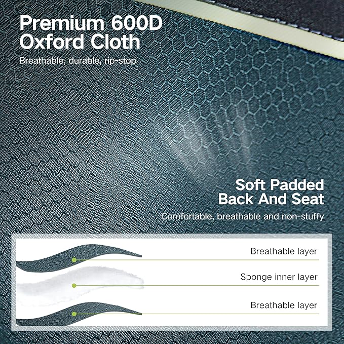 • 【CAMPING CHAIR With Premium Material】 The lawn chair with ergonomic padded back, seat and armrest provide max comfort for your body. The durable double-layer 600D padded oxford fabric with powder-coated steel tube frame enables you deserve a comfortable and safe chair