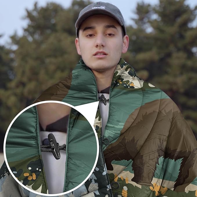 • Multipurpose Puffer Blanket and Poncho: This is a multi-purpose puffy blanket ultralight. In addition to being used as a warm camping blanket for sleeping for cold weather, the buttons on both sides combine to be used as a poncho, which is very convenient and can free your hands