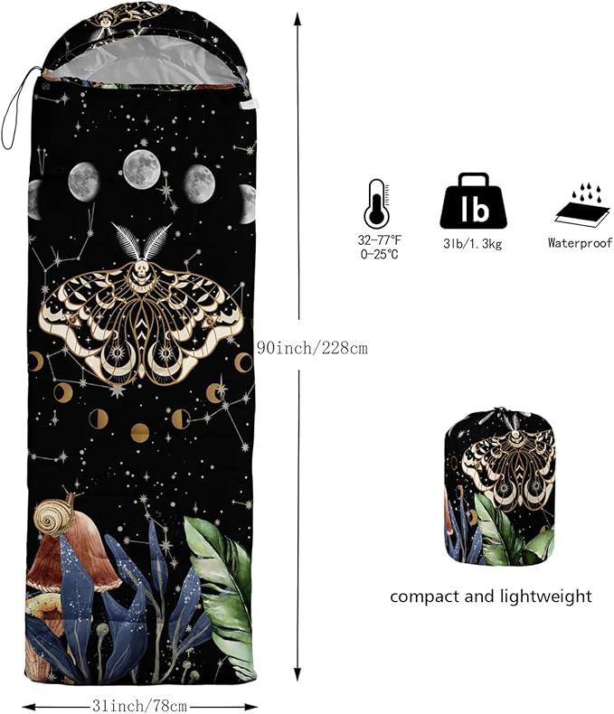 • 🌈【Fashion Design】SIZE - 31 by 90 inches (W x D). Our sleeping bag can be used in 3 seasons with a design temperature of 32℉-77℉(0℃-25℃). These bags also have a weather resistant waterproof design to keep you warm and prevent you from any dampness.
