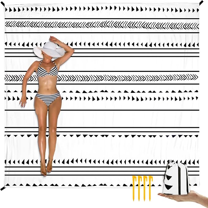 • Wind Resistant : Our white geometric style beach blanket comes with 4 anchor stakes and 4 sand pockets. On windy days, if you don't have a lot of stuff on your beach mat, just fill the built-in corner pockets with sand to weigh it down or use the four included stakes to keep it in place.